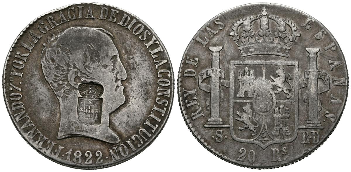 FERNANDO VII (1808-1833). 20 Reales. (Ar. 26,66g/38mm). 1822. Sevilla. RD. (Cal-2019-1423). Resello de Portugal en anverso (MBC+). BC+.