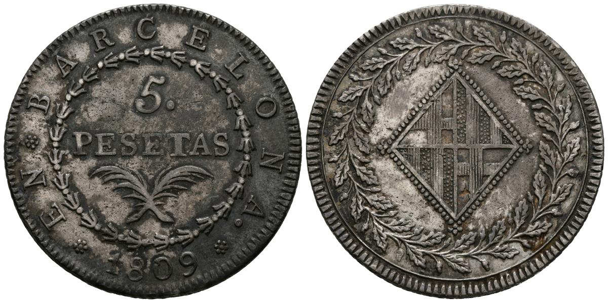 CATALUÑA NAPOLEONICA (1808-1814). 5 Pesetas. (Ar. 27,00g/40mm). 1809. Barcelona. (Cal-2019-45). MBC+.
