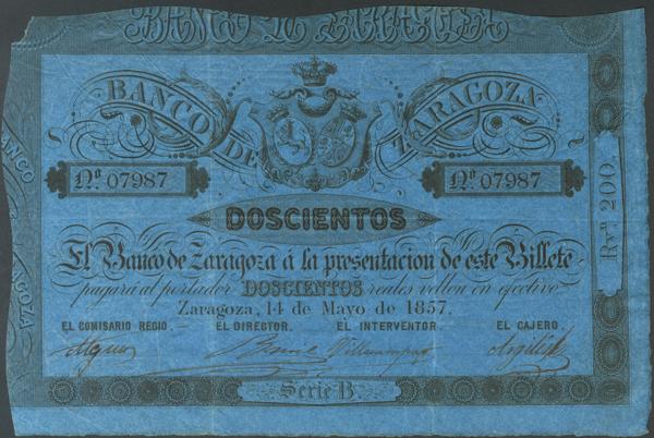 200 Reales. 14 de Mayo de 1857. Banco de Zaragoza. Serie B y con matriz. (Edifil 2017: 127). SC-.