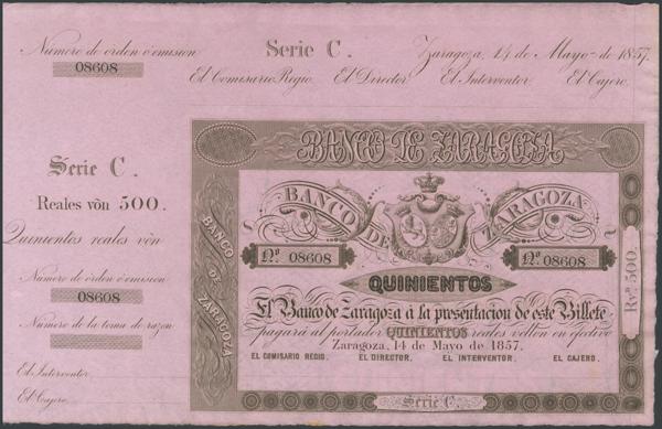 500 Reales. 14 de Mayo de 1857. Banco de Zaragoza. Serie C y con matriz. (Edifil 2017: 128). SC-.