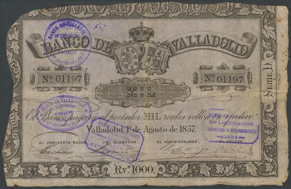 1000 Reales. 1 de Agosto de 1857. Banco de Valladolid. Serie D. (Edifil 2017: 134). MBC+.