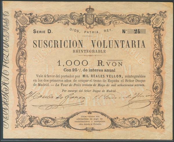 1000 Reales de Vellón. 30 de Mayo de 1876. Emisión Tour de Peilz. Serie D. (Edifil 2017: 199). MBC+.