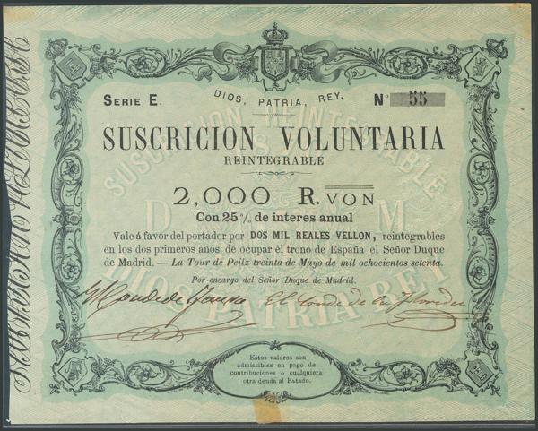 2000 Reales de Vellón. 30 de Mayo de 1876. Emisión Tour de Peilz. Serie E. (Edifil 2017: 200). EBC.