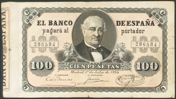 100 Pesetas. 1 de Julio de 1884. Sin serie. (Edifil 2017: 289). Sin reparaciones y con las típicas roturitas de los billetes clásicos (especialmente en el margen derecho), billete de enorme espectacularidad. EBC-.