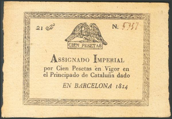 ASIGNADO IMPERIAL NAPOLEONICO. 100 Pesetas. 1814. (Edifil 2017: 15). MBC+. (corresponde con el billete catalogado en la cuarta edición de Edifil, tal y como indica el catálogo, es una fantasía basada en los Asignados italianos y franceses).