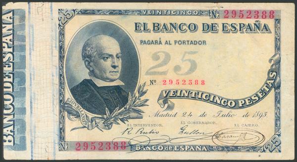 Conjunto de 100 billetes de 25 Pesetas emitido el 15 de Agosto de 1925, en diferentes tramos todos ellos correlativos. (Edifil 2017: 353). SC/EBC+.