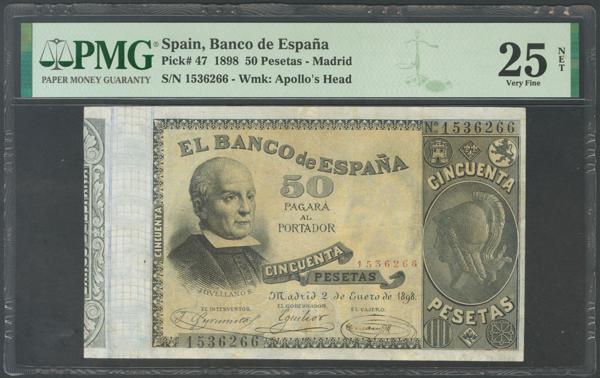 50 Pesetas. 2 de Enero de 1898. Sin serie. (Edifil 2017: 304). Inusual, billete reparado. MBC-. Encapsulado PMG25.
