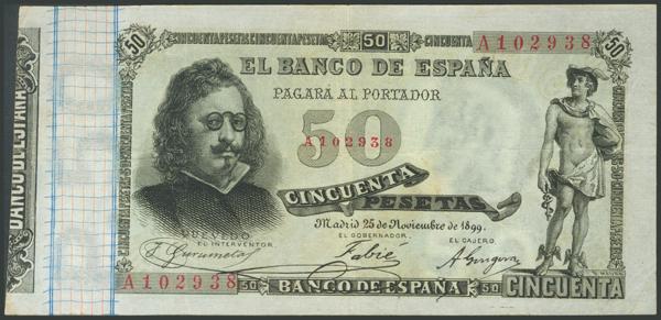 50 Pesetas. 25 de Noviembre de 1899. Serie A. (Edifil 2017: 307). Inusual, especialmente en esta conservación, billete de gran atractivo. EBC-.