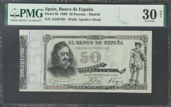 50 Pesetas. 25 de Noviembre de 1899. Serie A. (Edifil 2017: 307). Inusual, billete reparado. MBC. Encapsulado PMG30.