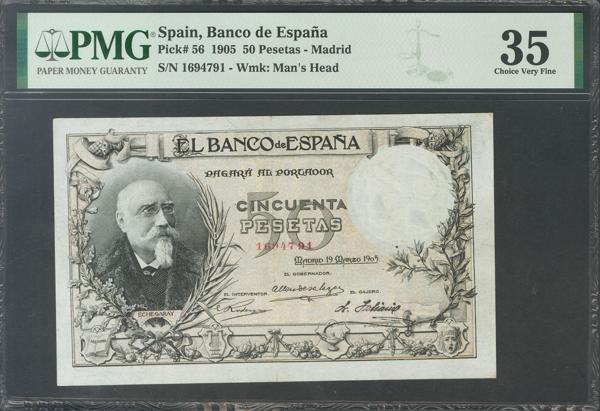 50 Pesetas. 19 de Marzo de 1905. Sin serie. (Edifil 2017: 312). Raro billete clásico sin ningún tipo de reparación. MBC+. Encapsulado PMG35.