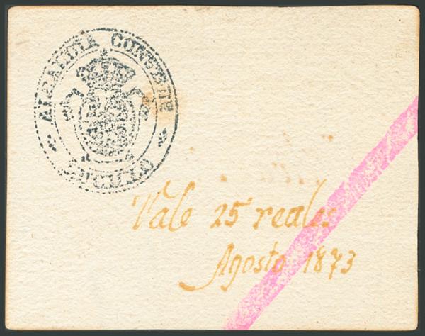 25 Reales. Agosto 1873. Vale de la Alcaldía Constitucional del Ayuntamiento de Lucillo (Léon). (Edifil 2017: página 26). Muy raro. EBC.