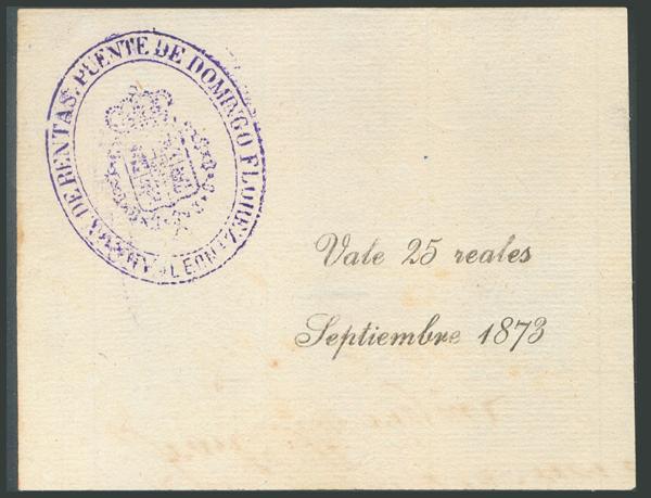 25 Reales. Septiembre de 1873. Vale de la Administración de Rentas de Puente de Domingo Flórez (León). (Edifil 2017: Página 26). Muy raro. EBC.