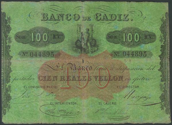 BANCO DE CADIZ. Emisión III. 100 Reales. Real Orden del 25 de Julio de 1847 (sin fechar). Cuatro firmas y resello en seco. (Edifil 2017: 78). Inusual, habituales erosiones que acompañan a los dobleces. MBC+.