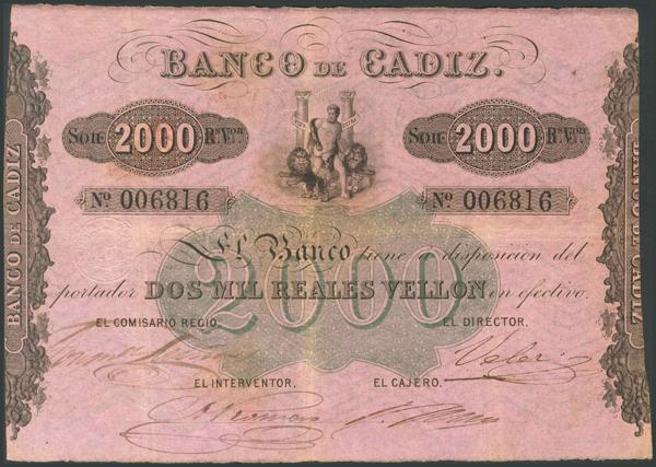 BANCO DE CADIZ. Emisión III. 2000 Reales. Real Orden del 25 de Julio de 1847 (sin fechar). Cuatro firmas y resello en seco. (Edifil 2017: 82). Inusual, habituales dobleces. MBC+.