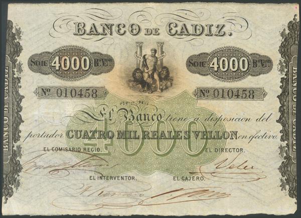 BANCO DE CADIZ. Emisión III. 4000 Reales. Real Orden del 25 de Julio de 1847 (sin fechar). Cuatro firmas y resello en seco. (Edifil 2017: 83). Inusual, habituales dobleces. MBC+.