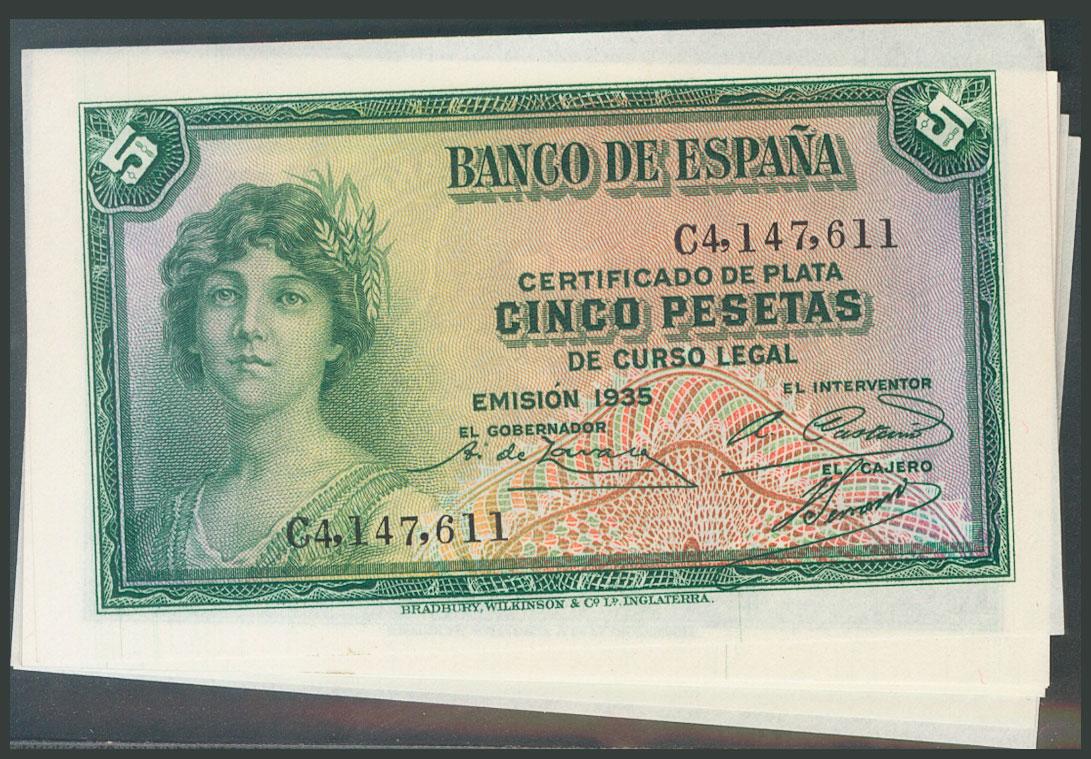 Conjunto de 12 billetes correlativos de 5 Pesetas emitidos en 1935 y con la serie C. (Edifil 2017: 363a). SC.