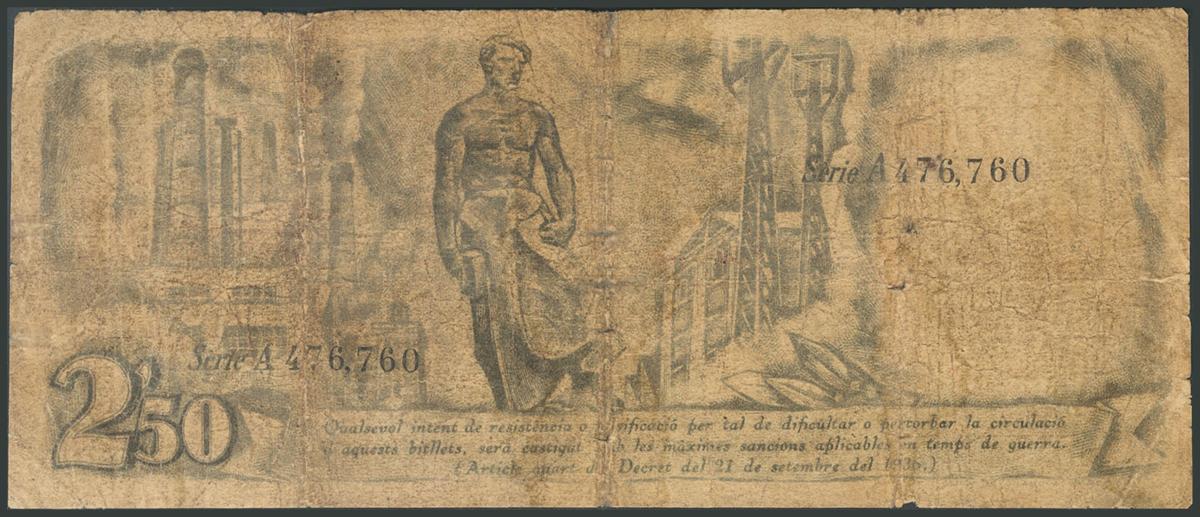 2´50 Pesetas. 25 de Septiembre de 1936. Generalitat de Catalunya. Serie A, en negro. (Edifil 2017: 372). RC.