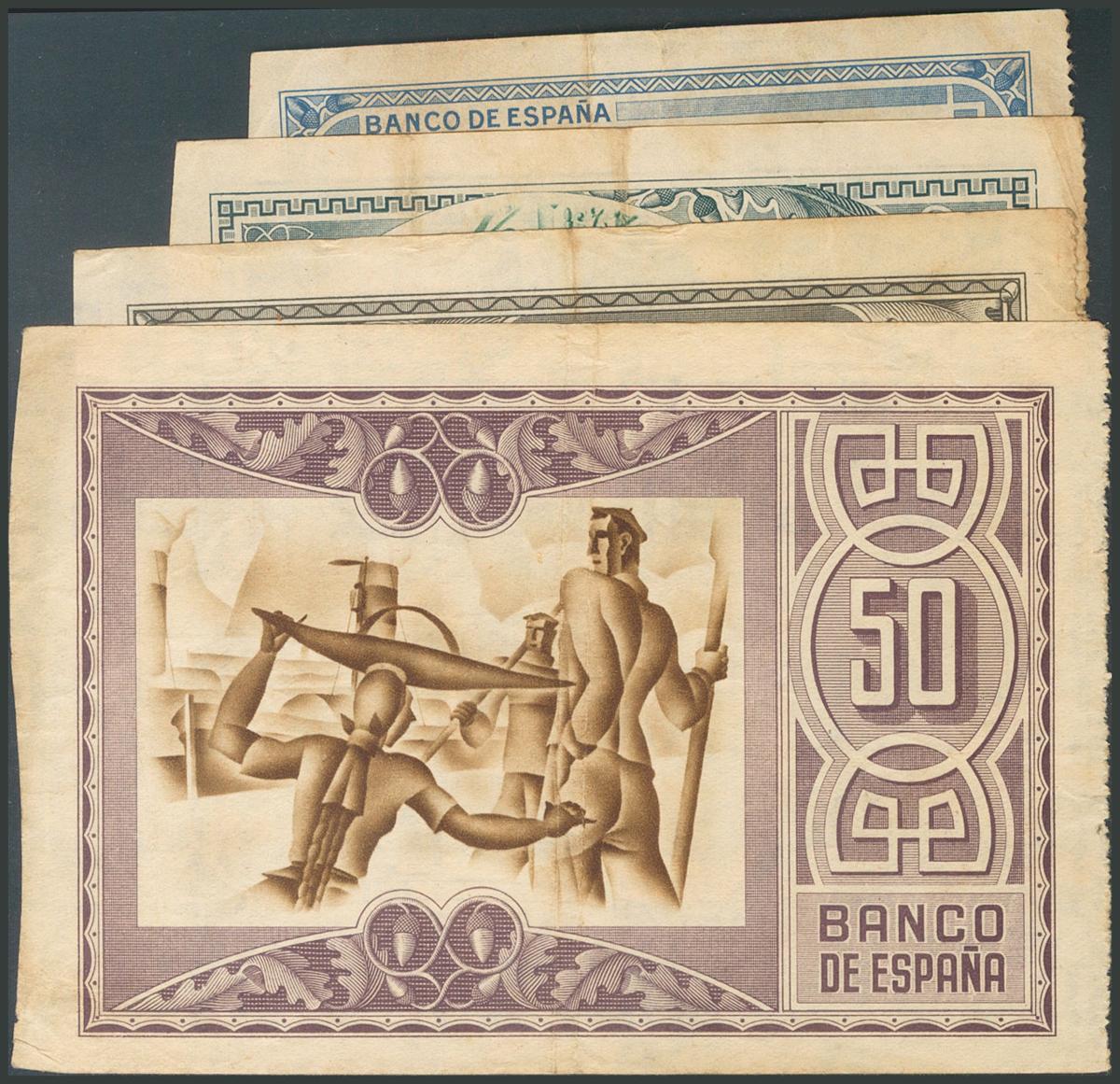 5 Pesetas, 10 Pesetas, 25 Pesetas y 50 Pesetas. 1 de Enero de 1937. Banco España, sucursal de Bilbao. Sin serie y con numeración. (Edifil 2017: 385b, 387f, 388a, 389b). MBC.