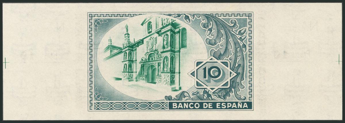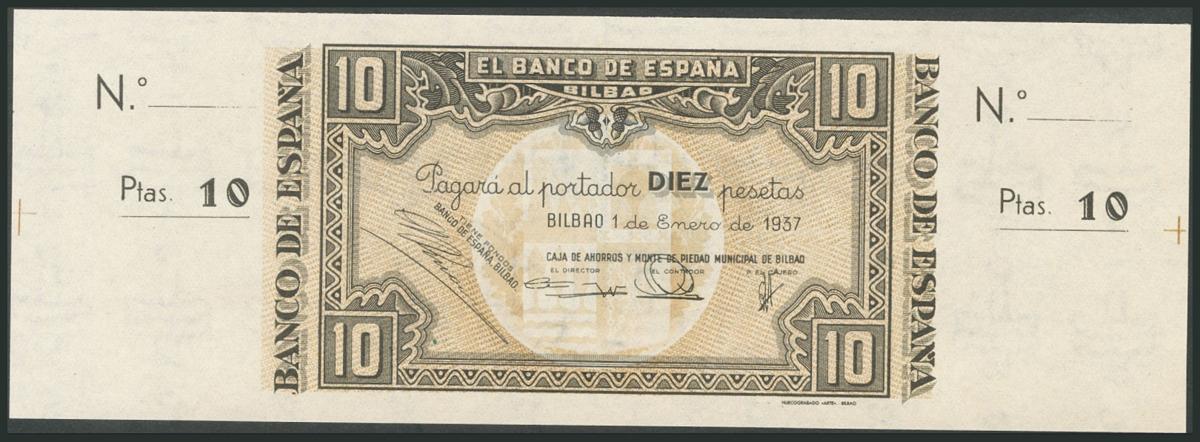 10 Pesetas. 1 de Enero de 1937. Sucursal de Bilbao, antefirma Caja de Ahorros y Monte de Piedad Municipal de Bilbao. Sin serie y sin numeración, con ambas matrices. (Edifil 2017: 387g). SC.
