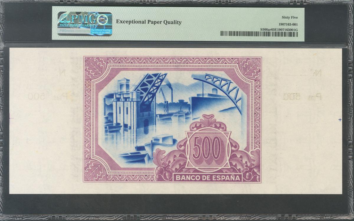 500 Pesetas. 1 de Enero de 1937. Sucursal de Bilbao, antefirma Banco de Bilbao. Sin serie y sin numeración, con ambas matrices. (Edifil 2017: NE26a). Muy raro en esta excepcional conservación. SC. Encapsulado PMG65EPQ. (Para hacerse una idea de la rareza de este billete en esta calidad, PMG otorga a día 28 de Diciembre de 2020, la segunda mejor calificación compartiéndola con otros dos billetes).