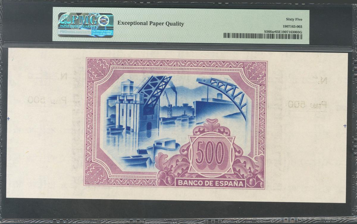 500 Pesetas. 1 de Enero de 1937. Sucursal de Bilbao, antefirma Banco Urquijo Vascongado. Sin serie y sin numeración, con ambas matrices. (Edifil 2017: NE26f). Muy raro en esta excepcional conservación. SC. Encapsulado PMG65EPQ. (Para hacerse una idea de la rareza de este billete en esta calidad, PMG otorga a día 28 de Diciembre de 2020, la segunda mejor calificación compartiéndola con otros dos billetes).