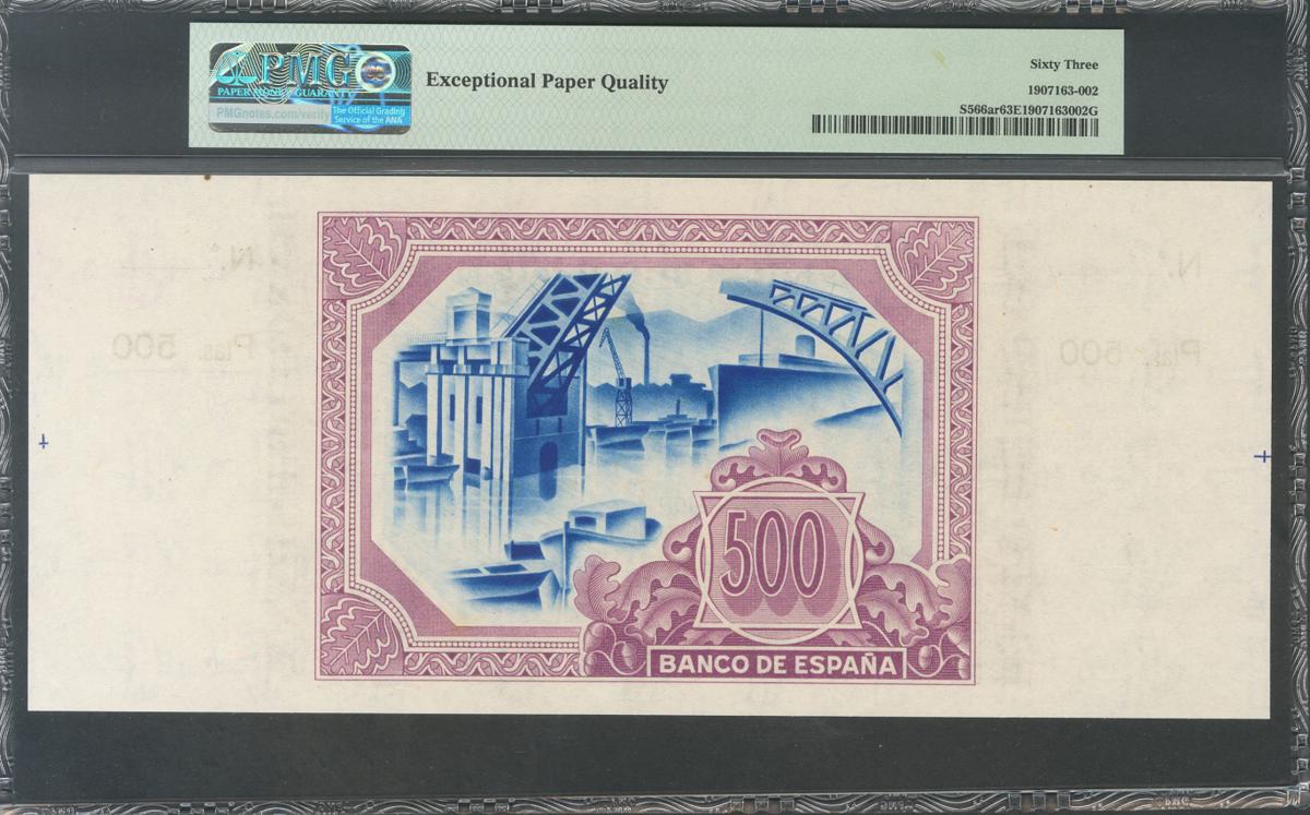 500 Pesetas. 1 de Enero de 1937. Sucursal de Bilbao, antefirma Banco de Vizcaya. Sin serie y sin numeración, con ambas matrices. (Edifil 2017: NE26g). Muy raro en esta excepcional conservación. SC. Encapsulado PMG63EPQ. (Para hacerse una idea de la rareza de este billete en esta calidad, PMG otorga a día 28 de Diciembre de 2020, la séptima mejor calificación compartiéndola con otro billete).