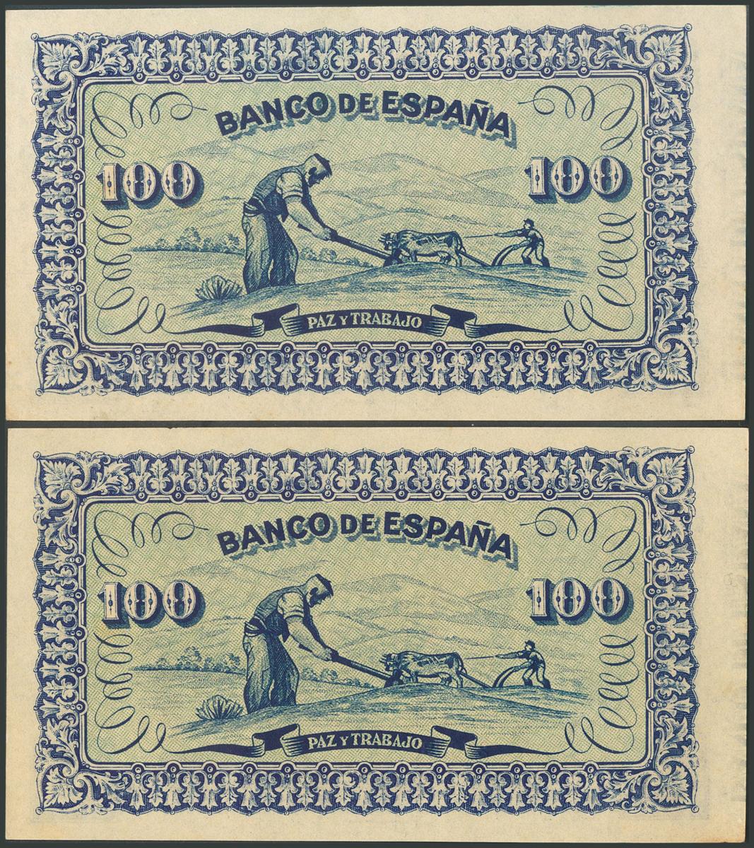 100 Pesetas. Septiembre 1937. Banco de España, sucursal de Gijón. Pareja correlativa. Sin serie. (Edifil 2017: 399). EBC+.