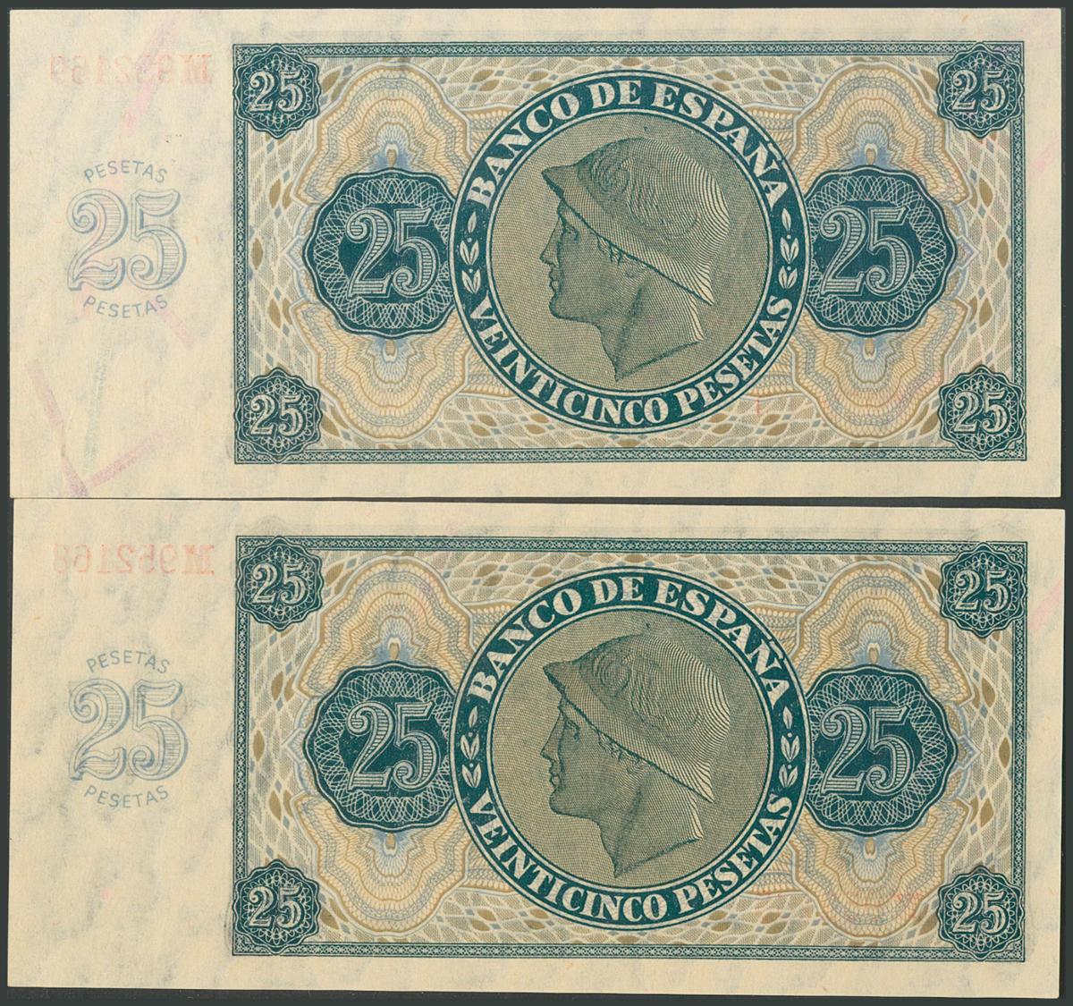 25 Pesetas. 21 de Noviembre de 1936. Pareja correlativa. Serie M. (Edifil 2017: 419a). Conserva todo su apresto original. SC.