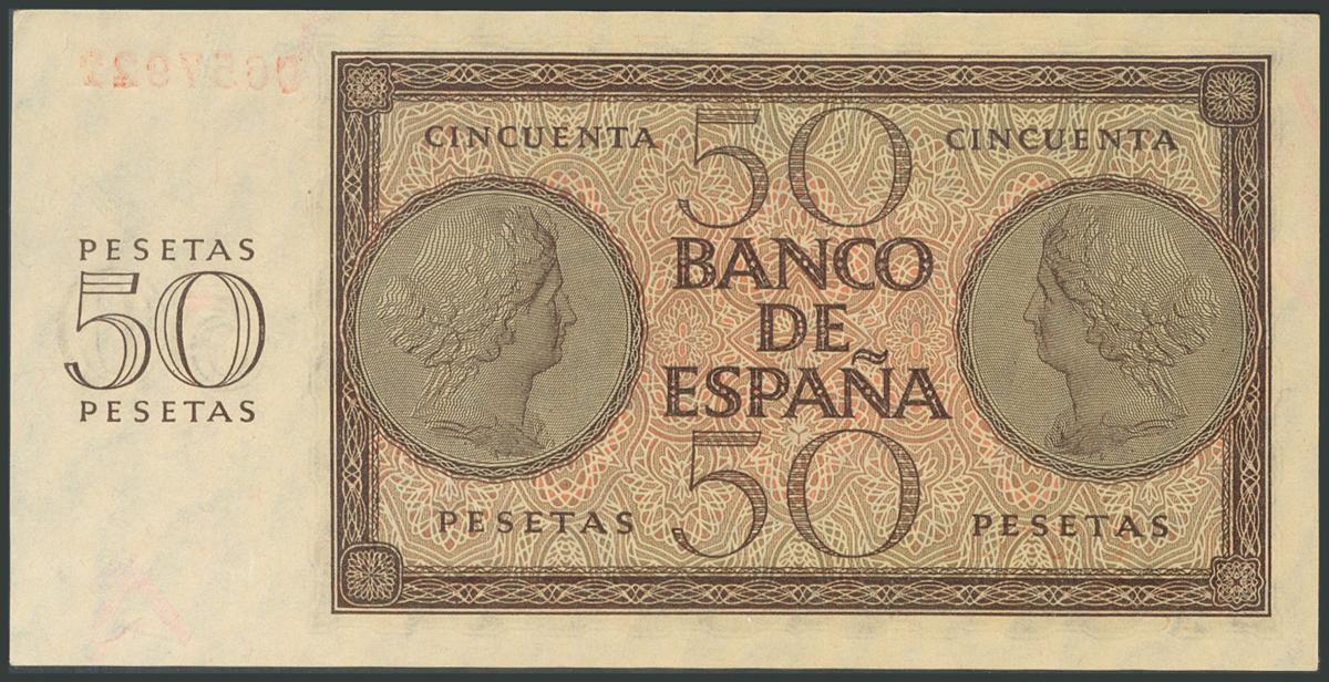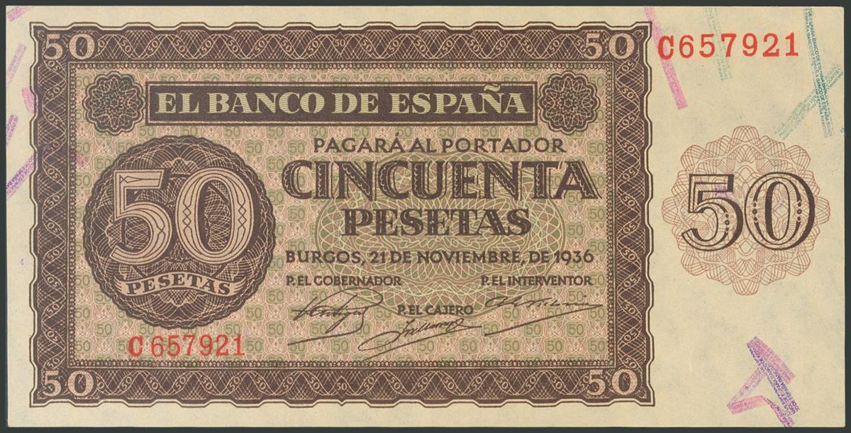 50 Pesetas. 21 de Noviembre de 1936. Serie C. (Edifil 2017: 420a). Inusual en esta calidad y apresto original, imperceptibles puntitos de grapa. SC-.
