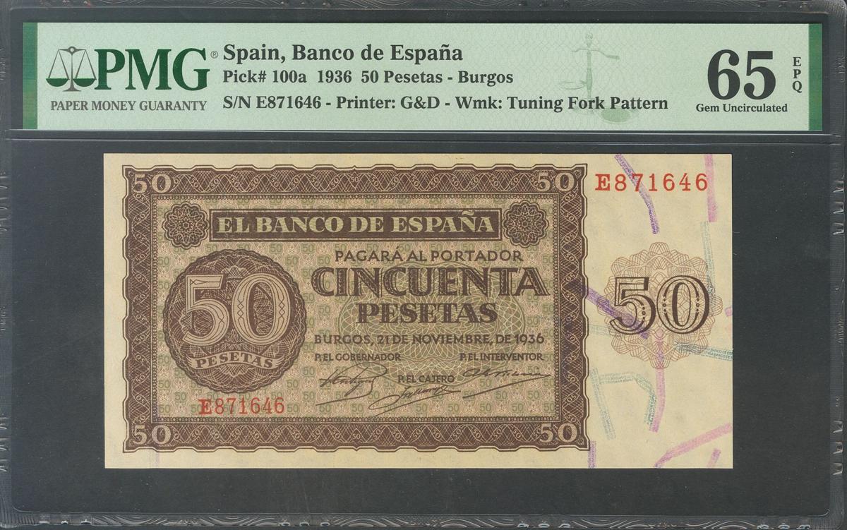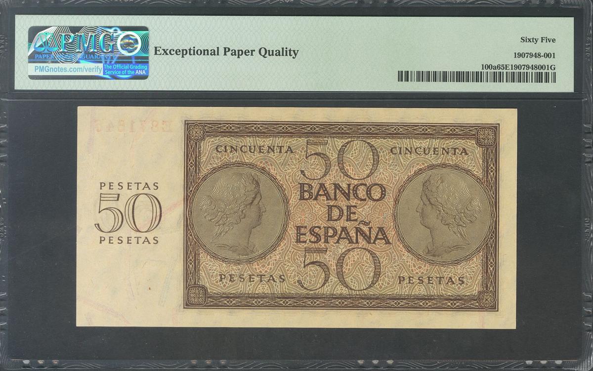 50 Pesetas. 21 de Noviembre de 1936. Serie E. (Edifil 2017: 420a). Muy raro, especialmente en esta excepcional calidad, conserva todo su apresto original. SC. Encapsulado PMG65EPQ.