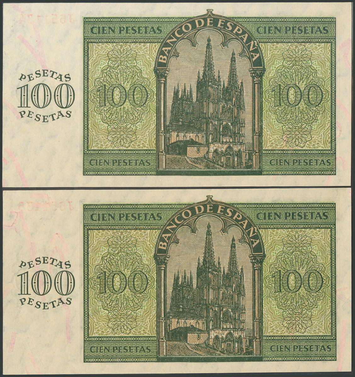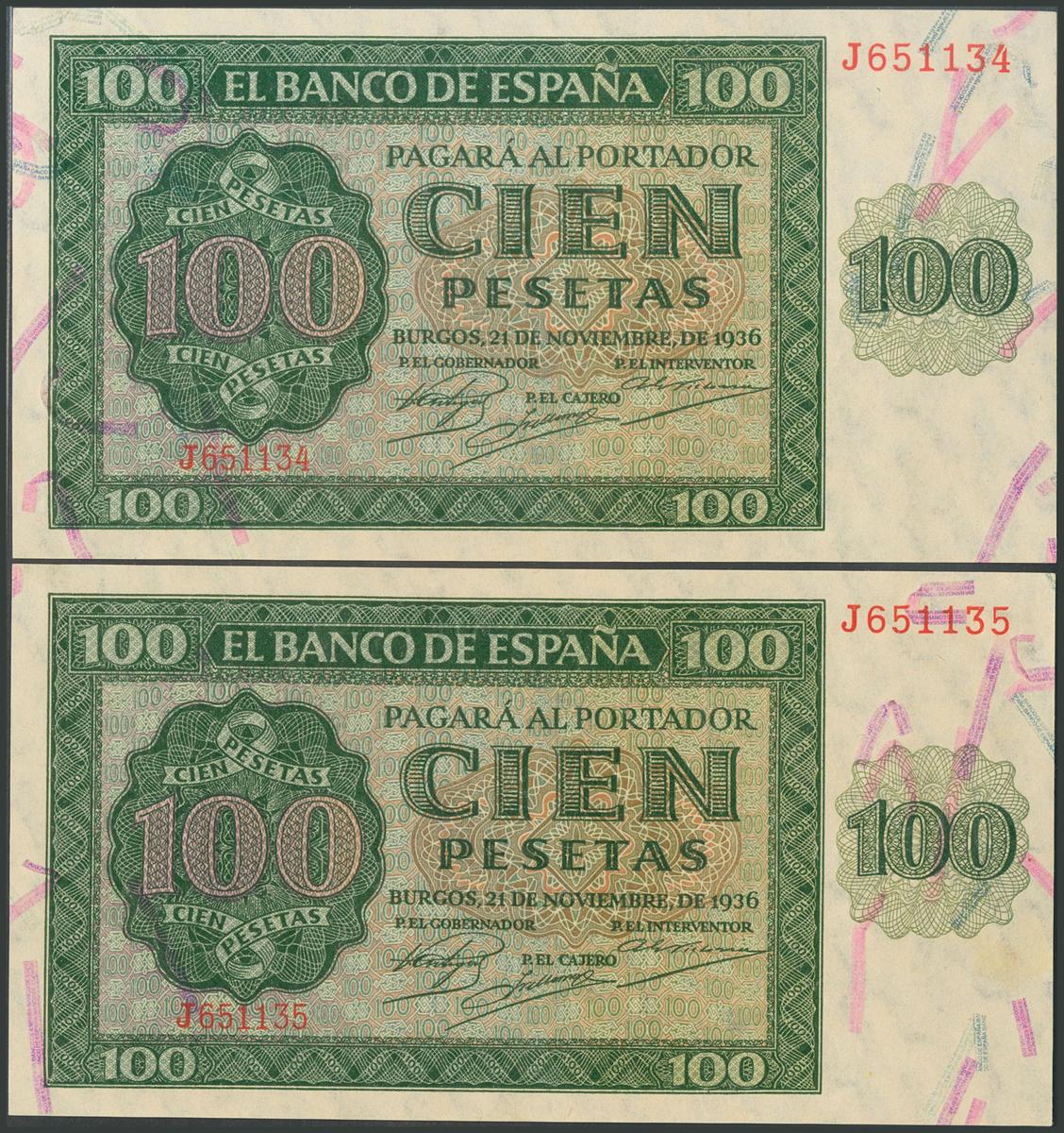 100 Pesetas. 21 de Noviembre de 1936. Pareja correlativa. Serie J. (Edifil 2017: 421a). Conserva todo su apresto original. SC.