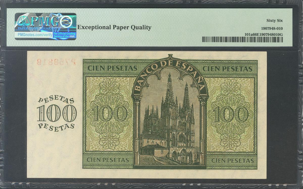 100 Pesetas. 21 de Noviembre de 1936. Serie P. (Edifil 2017: 421a). Conserva todo su apresto original. SC. Encapsulado PMG66EPQ.