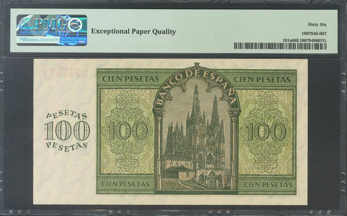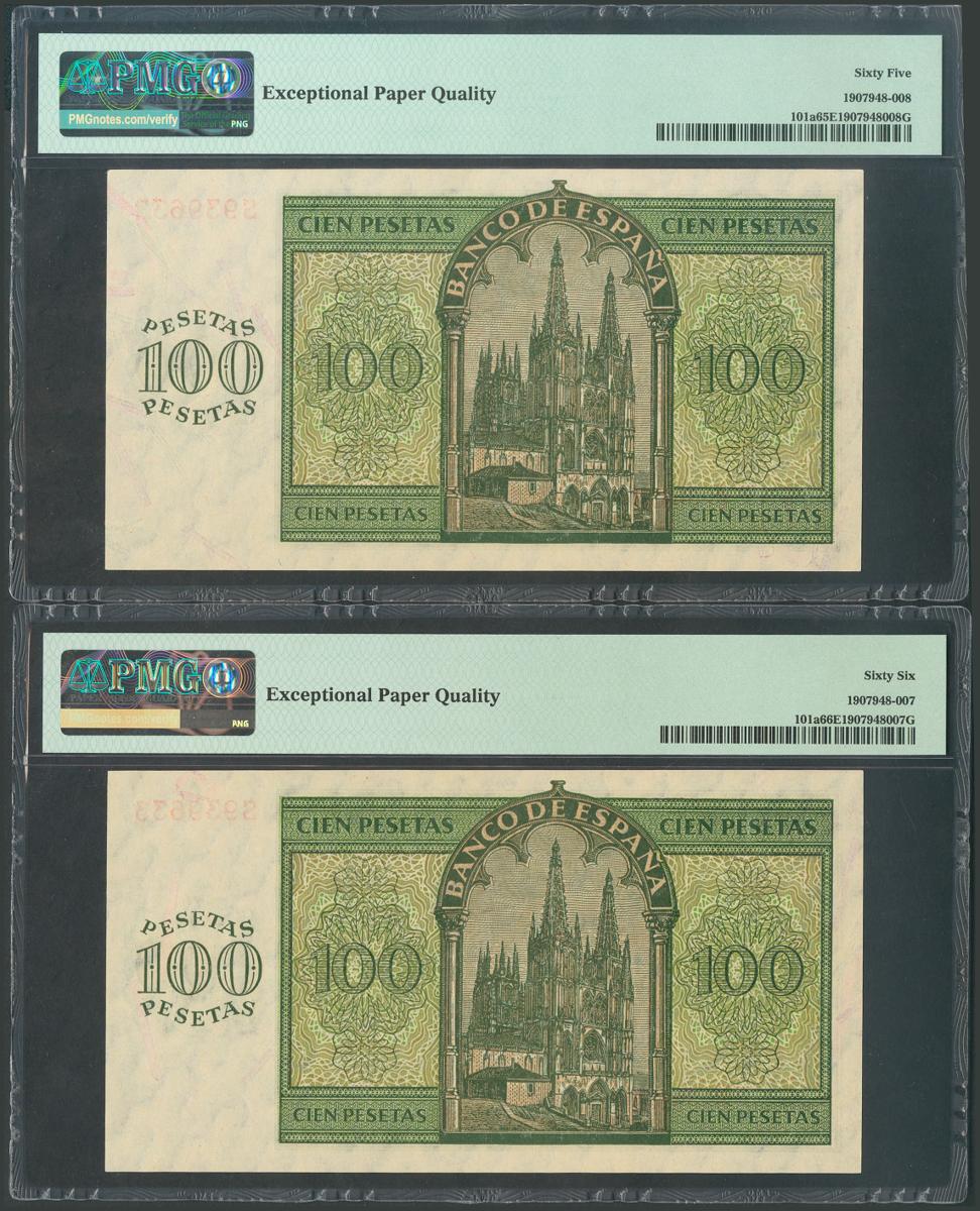 100 Pesetas. 21 de Noviembre de 1936. Pareja correlativa. Serie S. (Edifil 2017: 421a). Rara en esta excepcional calidad, conserva su apresto original. SC. Encapsulado PMG65EPQ y 66EPQ, respectivamente.