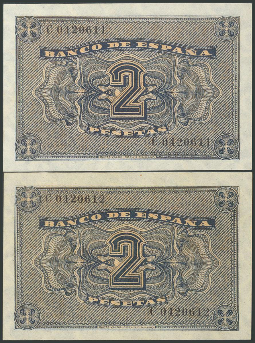 2 Pesetas. 30 de Abril de 1938. Pareja correlativa. Serie C. (Edifil 2017: 429a). Conserva todo su apresto original. SC.