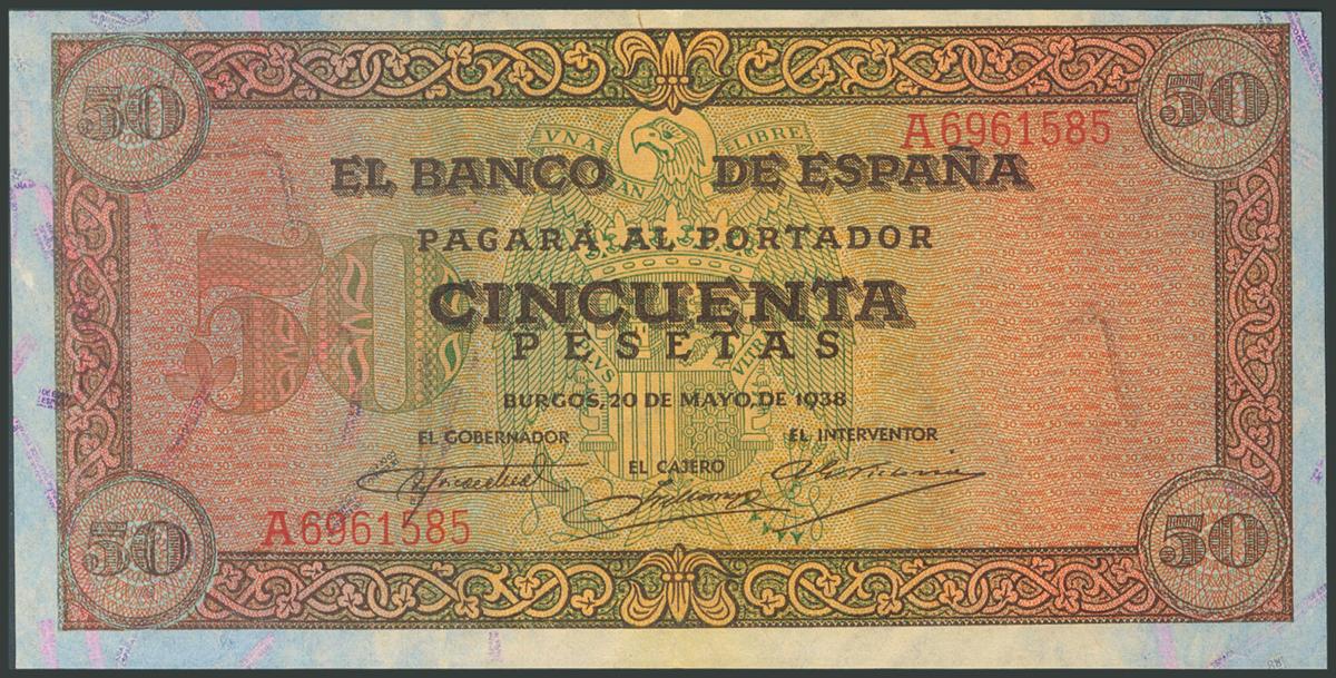 50 Pesetas. 20 de Mayo de 1938. Serie A. (Edifil 2017: 431). Conserva todo su apresto original. EBC+.