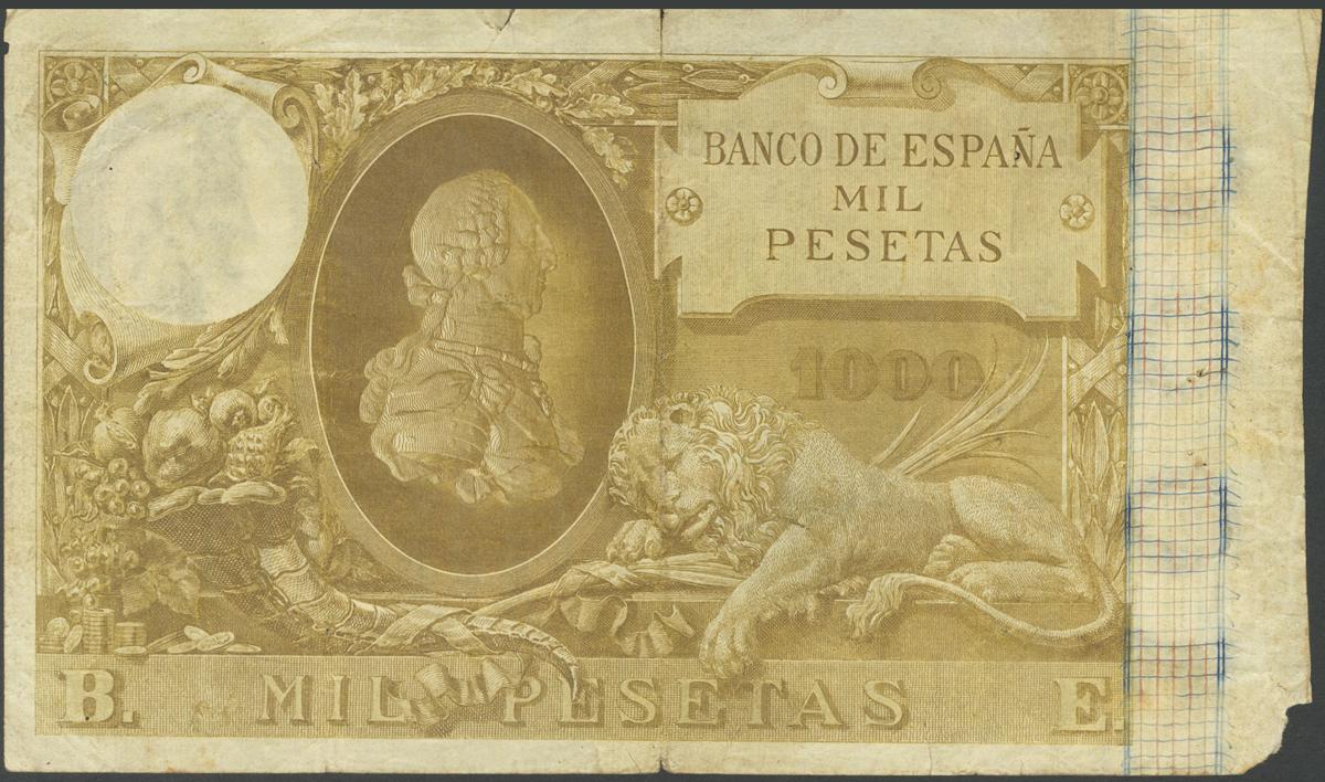1000 Pesetas. 1 de Mayo de 1895. Sin serie. (Edifil 2017: 303). Sin reparaciones y con las típicas roturitas de los billetes clásicos (especialmente en el margen superior), raro así, billete de enorme espectacularidad, ayuda a ello su enorme tamaño. MBC.