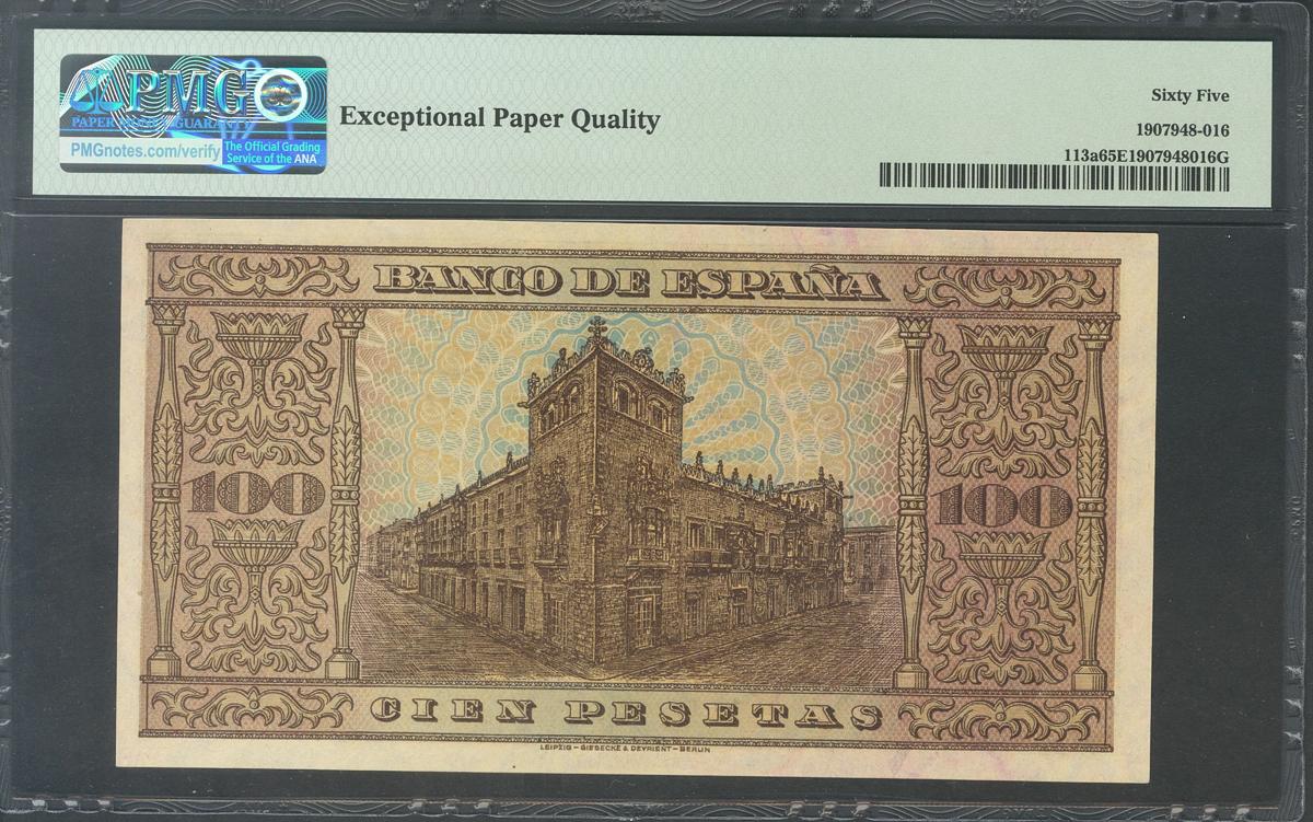 100 Pesetas. 20 de Mayo de 1938. Serie G. (Edifil 2017: 432a). Raro en esta calidad, conserva todo su apresto original. SC. Encapsulado PMG65EPQ.