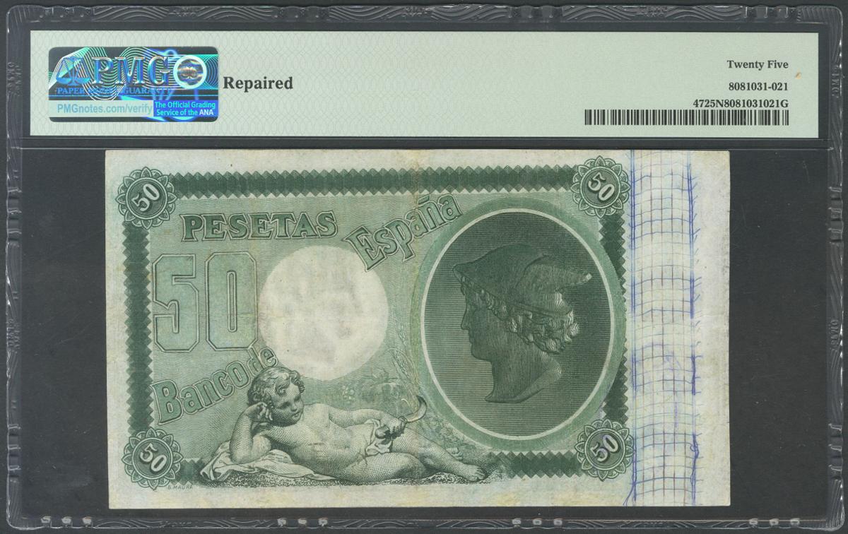 50 Pesetas. 2 de Enero de 1898. Sin serie. (Edifil 2017: 304). Inusual, billete reparado. MBC-. Encapsulado PMG25.
