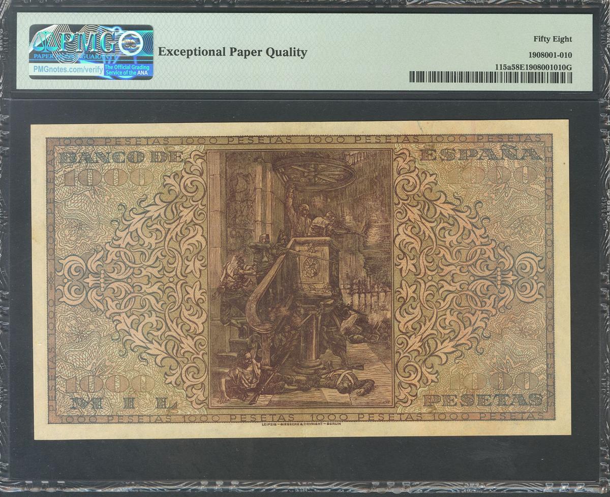 1000 Pesetas. 20 de Mayo de 1938. Serie A. (Edifil 2017: 434). Conserva su apresto original. EBC+. Encapsulado PMG58EPQ. (para hacerse una idea de la rareza de este billete en esta calidad, PMG otorga a día 1 de Abril de 2021 la sexta mejor calificación a este billete junto a otro billete).