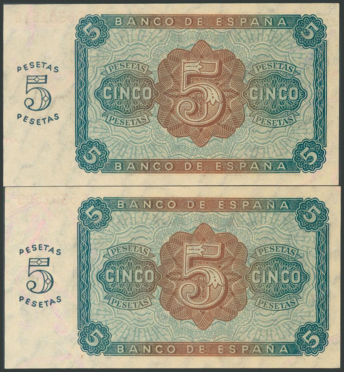 5 Pesetas. 10 de Agosto de 1938. Pareja correlativa. Serie B. (Edifil 2017: 435a). Conserva todo su apresto original. SC.