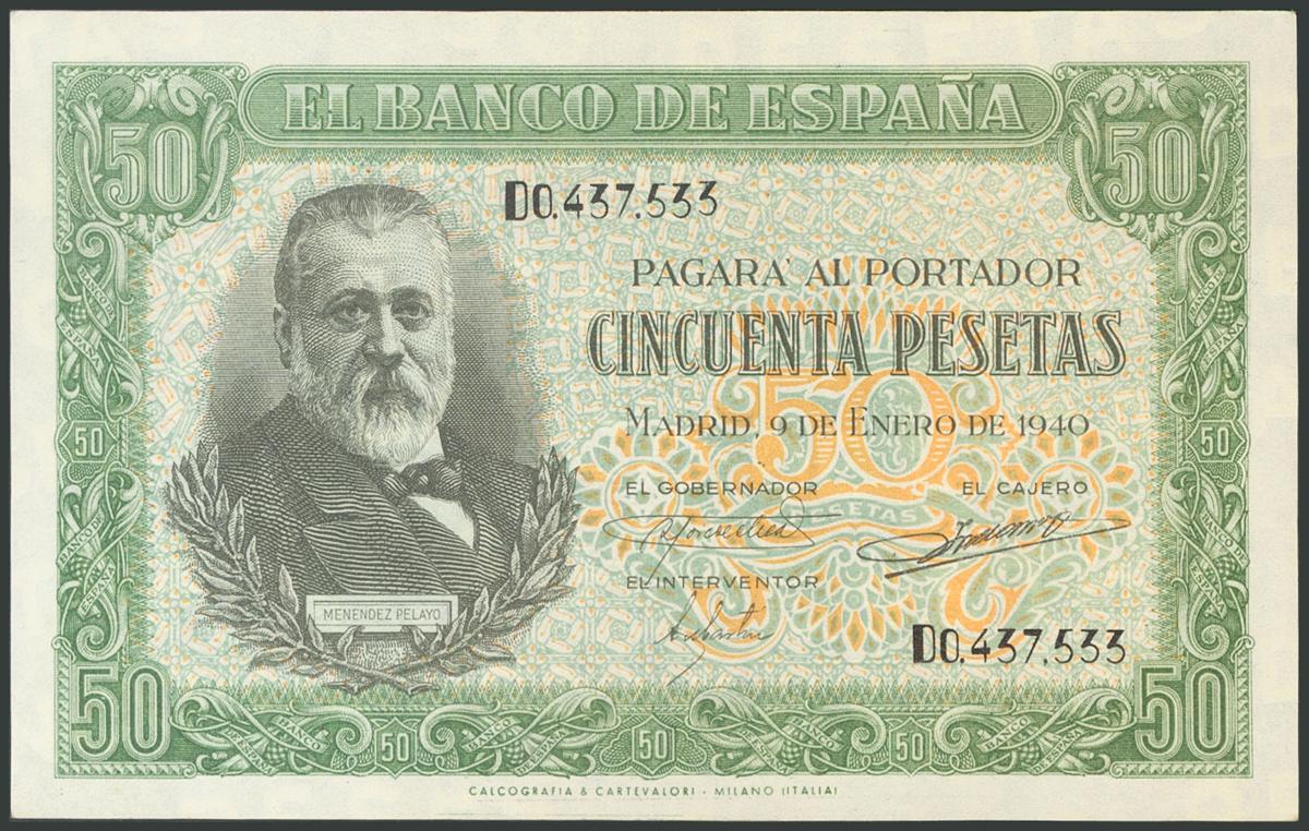50 Pesetas. 9 de Enero de 1940. Serie D. (Edifil 2017: 437a). Inusual en esta conservación, apresto original. SC.
