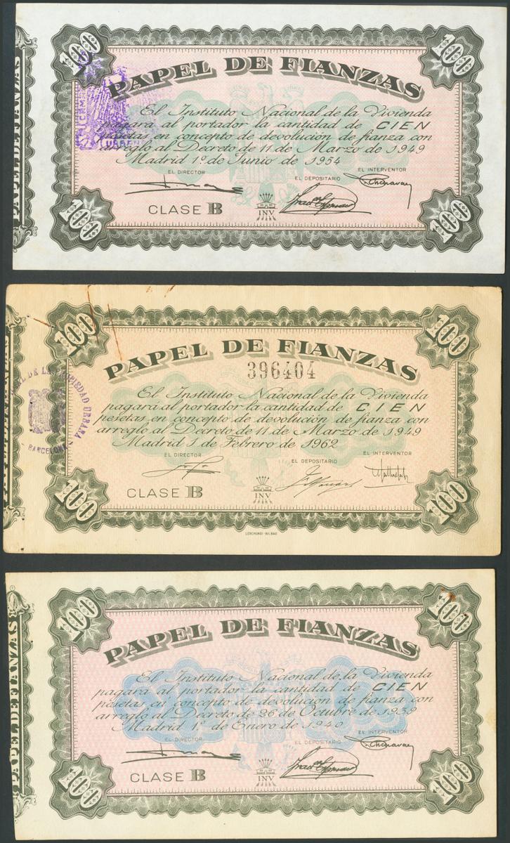 Conjunto de 7 billetes de PAPEL DE FINANZAS de 10 Pesetas (2), 50 Pesetas (1), 100 Pesetas (3) y 500 Pesetas (1), emitidos entre el 1 de Enero de 1940 y el 1 de Febrero de 1962. EBC/MBC.