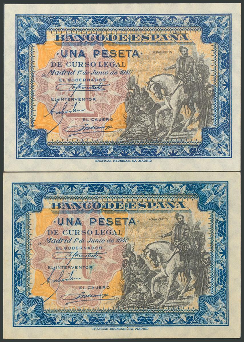 Conjunto de 2 billetes de 1 Peseta emitidos el 1 de Junio de 1940 y sin serie y con la serie A, respectivamente. (Edifil 2017: 441, 441a). SC/SC-.