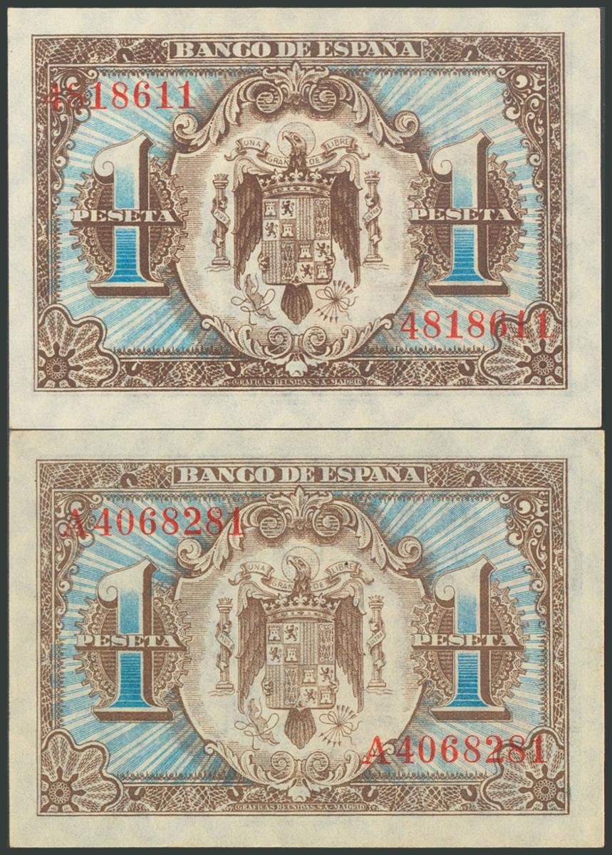 Conjunto de 2 billetes de 1 Peseta emitidos el 1 de Junio de 1940 y sin serie y con la serie A, respectivamente. (Edifil 2017: 441, 441a). SC/SC-.