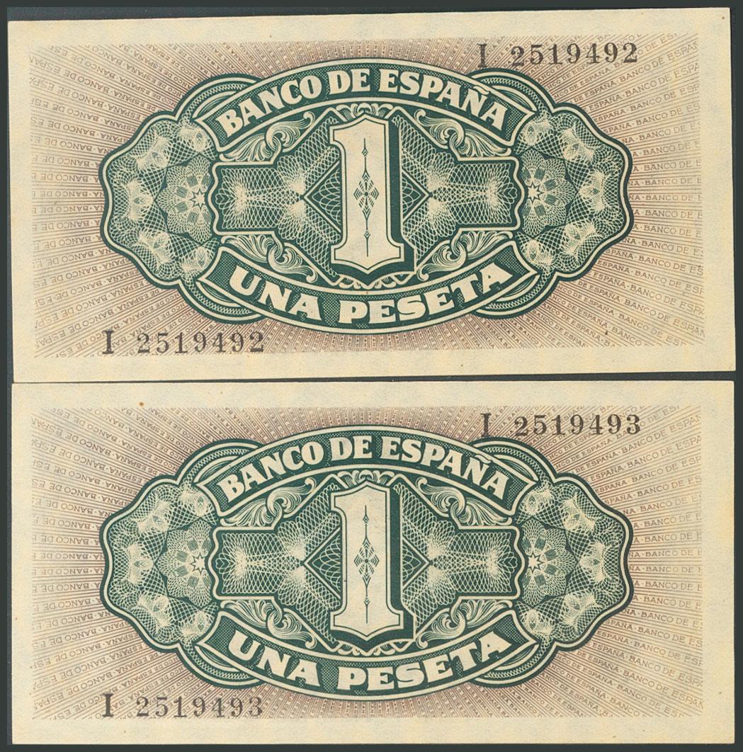 1 Peseta. 4 de Septiembre de 1940. Pareja correlativa. Serie I, última serie emitida. (Edifil 2017: 442a). Conserva todo su apresto original. SC.