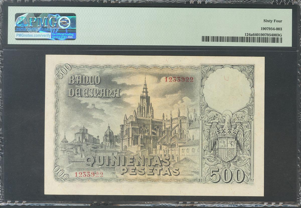 500 Pesetas. 21 de Octubre de 1940. Sin serie. (Edifil 2017: 444). Muy raro, especialmente en esta calidad. SC. Encapsulado PMG64.