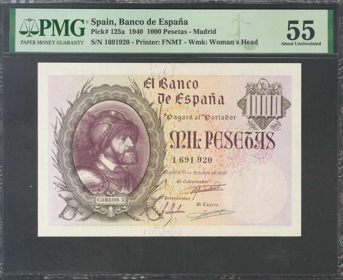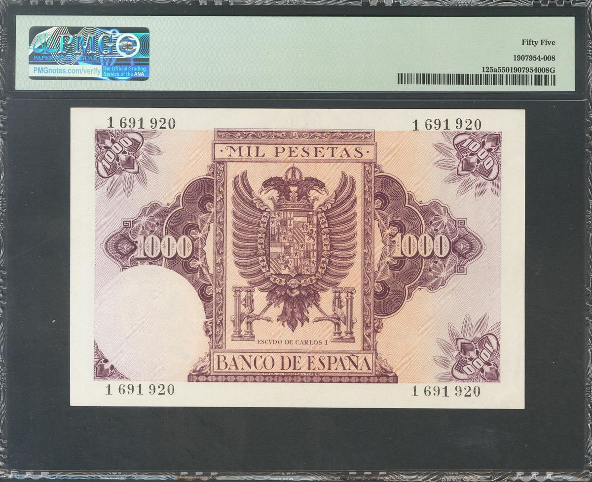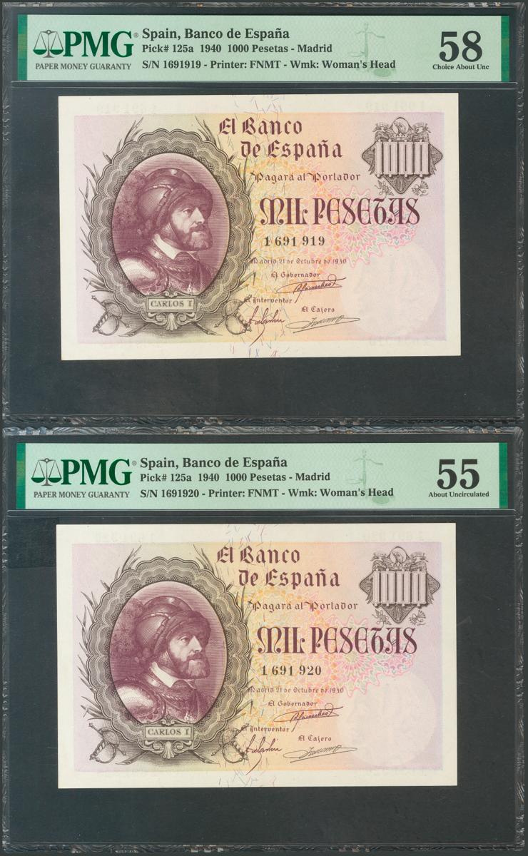 1000 Pesetas. 21 de Octubre de 1940. Pareja correlativa. Sin serie. (Edifil 2017: 445). Rarísima pareja, la mejor conservada de todas las conocidas. EBC+. Encapsulados PMG58 y 55, respectivamente.