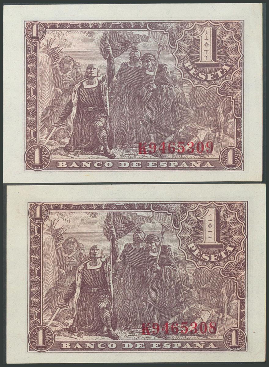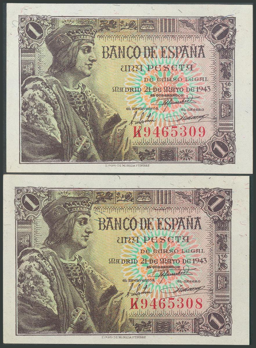 1 Peseta. 21 de Mayo de 1943. Pareja correlativa. Serie K. (Edifil 2017: 447a). Conserva todo su apresto original. SC/SC-