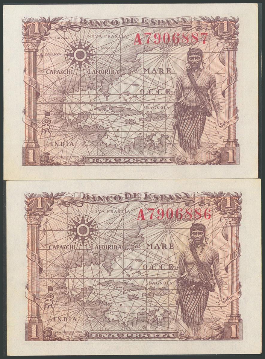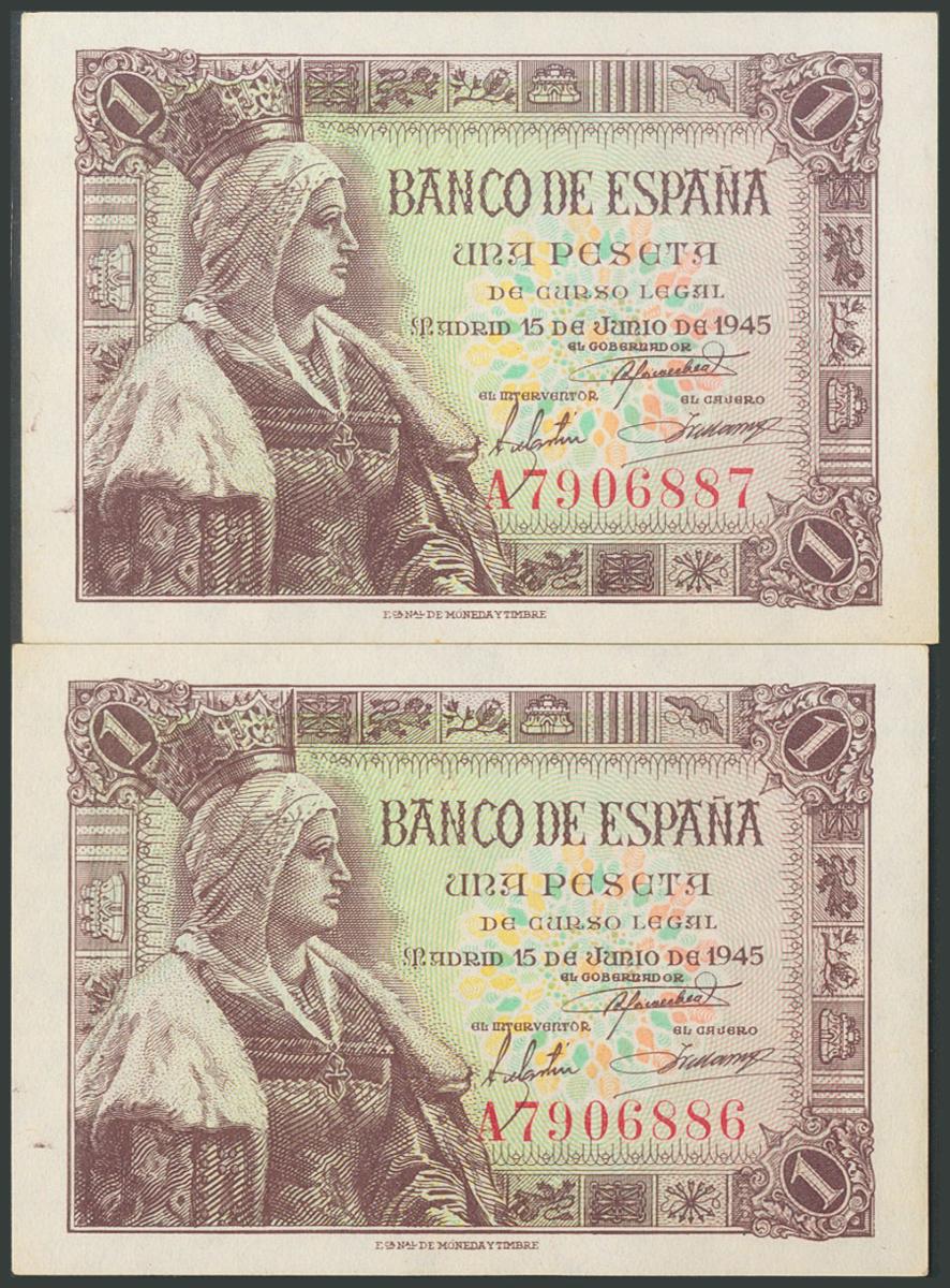 1 Peseta. 15 de Junio de 1945. Pareja correlativa. Serie A. (Edifil 2017: 448a). Apresto original. SC.