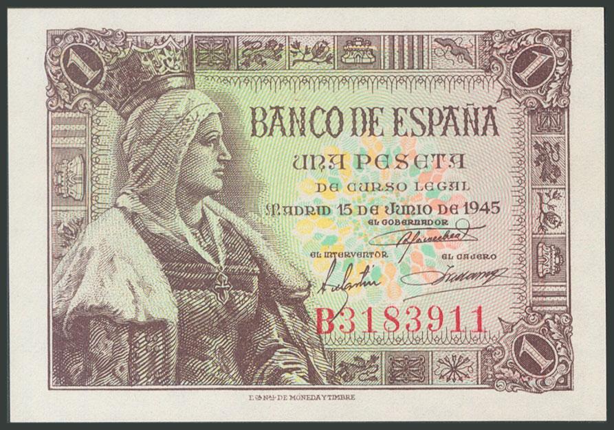 1 Peseta. 15 de Junio de 1945. Serie B. (Edifil 2017: 448a). Apresto original. SC.
